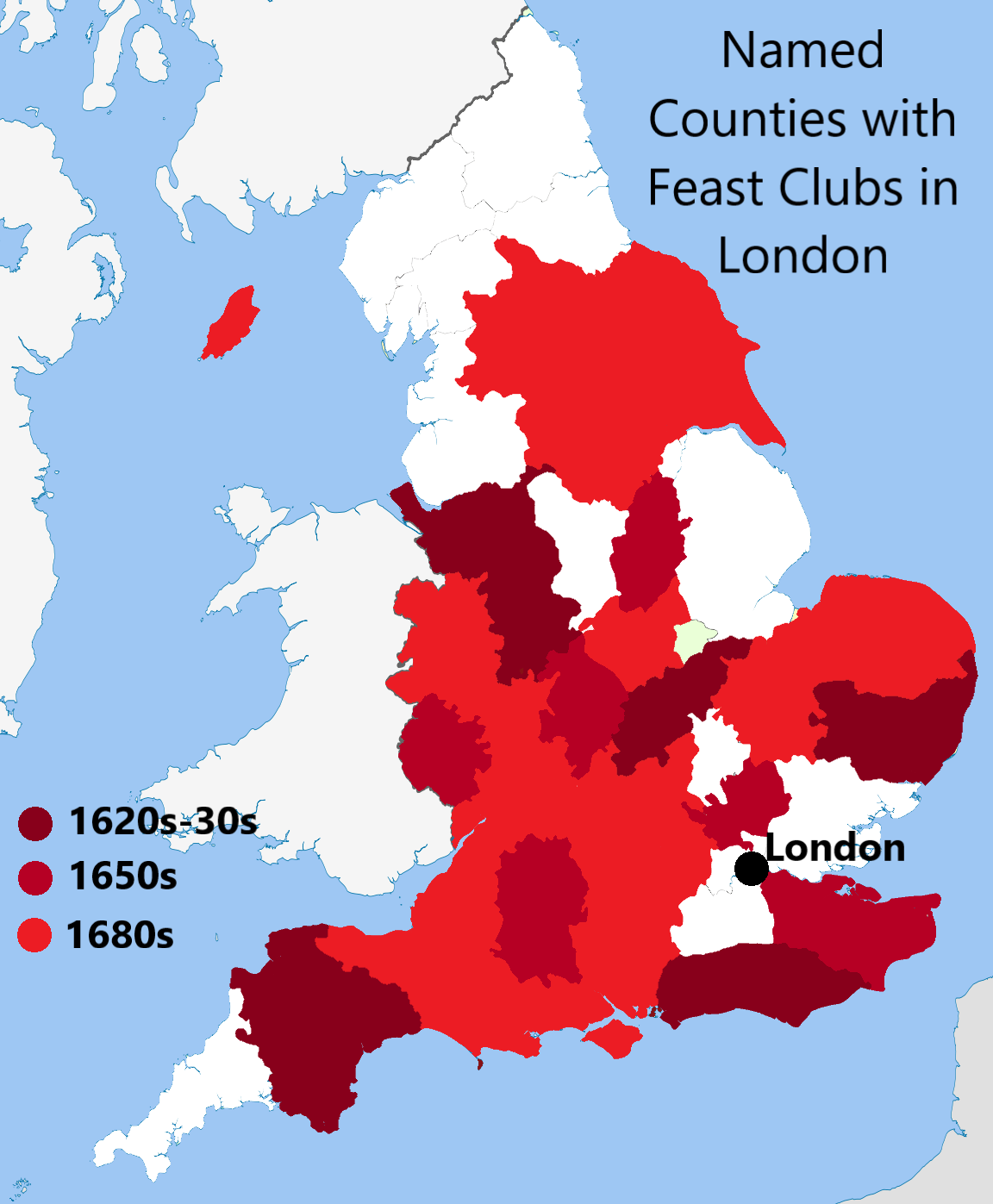 The county-specific London feasting clubs are very well attested for the late seventeenth century, largely as they often began with sermons, some of which were published. Along with the rise of Puritanism, which made such sermons more common, there are direct records of county feasts in London in the 1650s for Cheshire, Herefordshire, Hertfordshire, Kent, Northamptonshire, Nottinghamshire, Staffordshire, Suffolk, Warwickshire, and Wiltshire, as well as for London itself. For the 1670s and 80s, thanks to additional evidence from newspaper advertisements, we have direct evidence of feasts held for many more counties, and even the Isle of Man.7 By contrast, the citizens of England’s third-largest city, Bristol, seem to have only had held feasts for the immediately surrounding counties of Gloucestershire, Somerset, and Wiltshire.